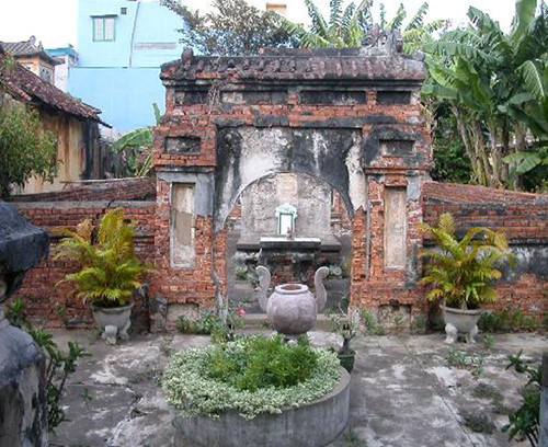 Từ bình phong tiền nhìn vào là trụ cổng (tiếp giáp với khuôn thành, sân tế có bồn hoa hình tròn và lư hương, cổng vào khu mộ có mái giả ngói ống trổ cửa dạng vòm. Nhìn sâu sau vòm cửa có thể thấy hương án, bàn tế, bia và mộ (bị che khuất phần mái của mộ)