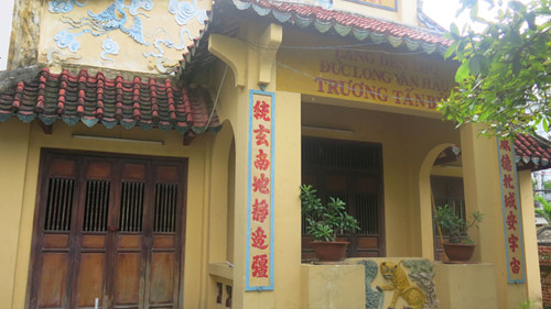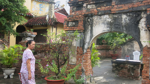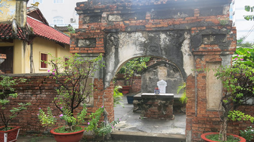 Cận cảnh cổng mộ, ngôi nhà có mái giả ngói ở bên trái là một phần của đền thờ Long Vân hầu Trương Tấn Bửu