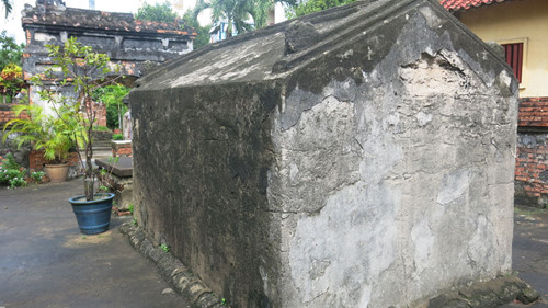 Một góc bàn tế, bia, mộ có hình dạng một ngôi nhà 2 mái vát chụm nhau và bình phong hậu