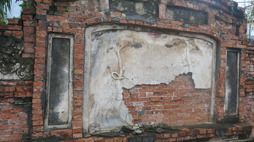 Bình phong hậu bị bong tróc hầu hết, phù điêu “tùng hạc” chỉ còn vài họa tiết