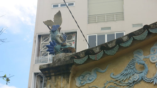 Phù điêu đắp nổi hình “vân phụng” ở chái tường đền thờ, còn trên mái có tượng cá hóa rồng