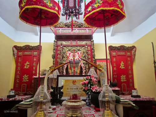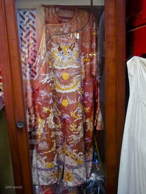 Bộ triều phục màu đỏ thêu rồng 4 móng đặt trong tủ kiếng ở đền thờ