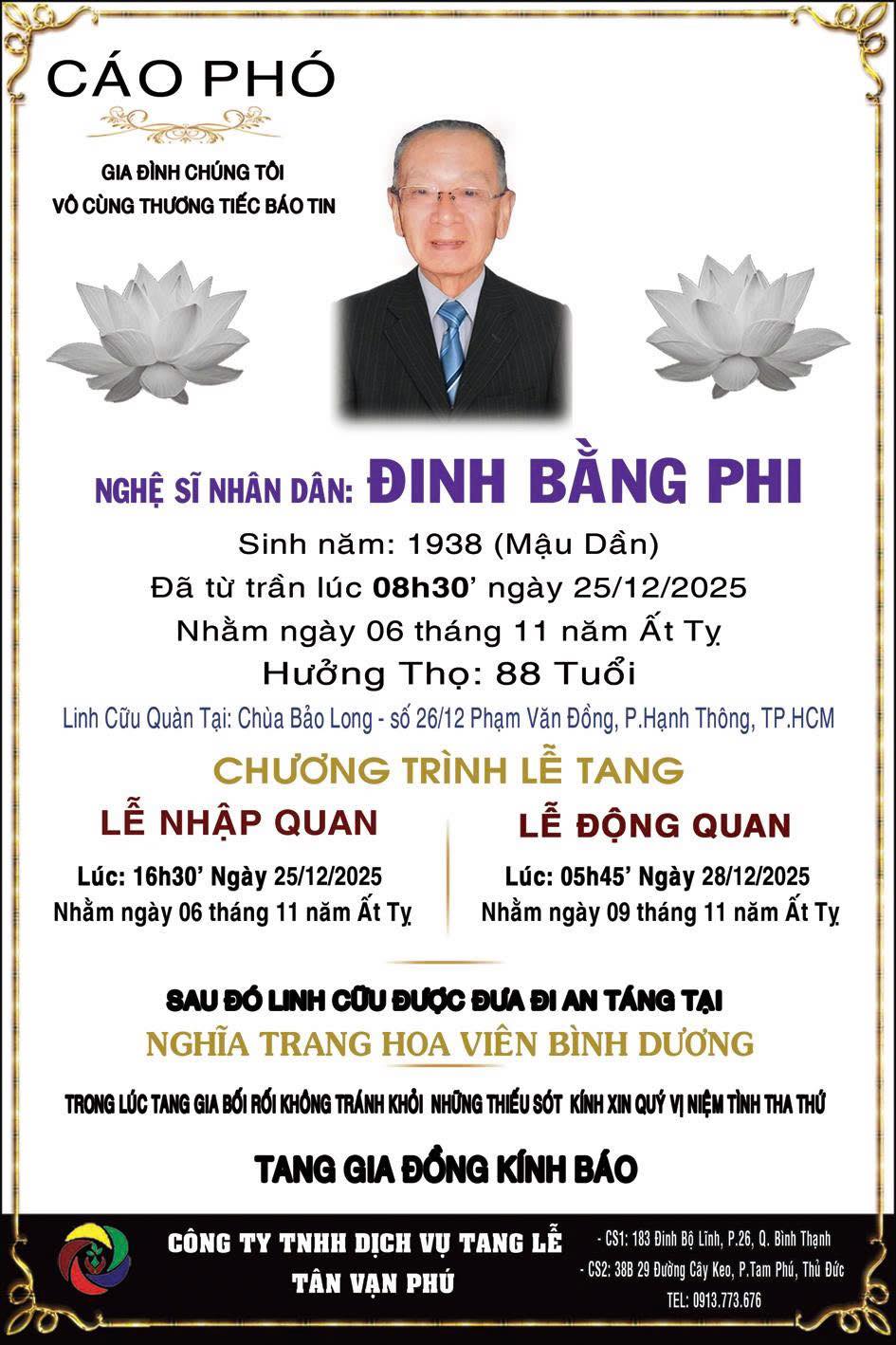 Nghệ sĩ Thanh Bình của Nhà hát Nghệ thuật hát bội TP.HCM, đau buồn cho Tuổi Trẻ Online hay gia đình NSND Đinh Bằng Phi thông tin ông vừa qua đời sáng nay, 25-12-2025.