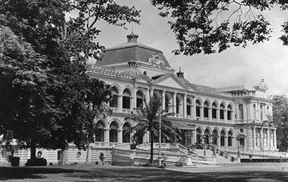 (hình trên: Dinh Độc Lập tại Sài Gòn năm 1957; hình dưới, trái: Lăng Ông Lê Văn Duyệt; hình dưới, phải: kinh thành Huế)