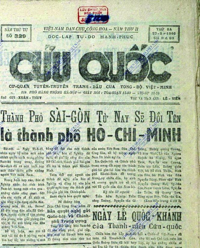 Theo Lam Điền, mải gần đây, nhóm nghiên cúu đã tìm được một tài liệu quan trọng về chuyện đổi tên Sài Gòn, đó là một bản tin trên báo Cứu Quốc, số ra ngày 27-8-1946, Hà Nội, in trên trang 1 và tiếp theo ở trang 4, cột 3. Toàn văn như sau: