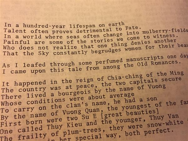 Anh nhớ lại mấy năm trước, ghé nhà giáo sư Trần Khánh ở San Jose, là thân phụ của xướng ngôn viên Mộng Lan ở Quận Cam. Ông từng ở trong ban phiên dịch cuốn từ điển Anh Việt của Nguyễn Văn Khôn ở Sài Gòn, qua Mỹ năm 1975 và dạy Anh văn ở trung học và đại học cộng đồng thành phố San Francisco suốt ba mươi sáu năm và đã nghỉ hưu. Giáo sư Khánh cho anh coi tập thơ Kim Vân Kiều do giáo sư Nguyễn Ngọc Bích dịch ra tiếng Anh, xuất bản năm 1973 tại Sài Gòn, có mấy dòng chữ và chữ ký của tác giả tặng cho một người nào đó.