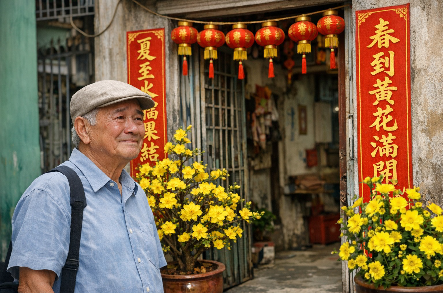 Nghĩa tới trước ngõ cụt, đương mò lại trí nhớ mòn mỏi của mình đọc hai câu liễn viết bằng chữ Hán dán trước nhà cũ của bà hàng xóm sống trong khu nhiều người Hoa nầy: