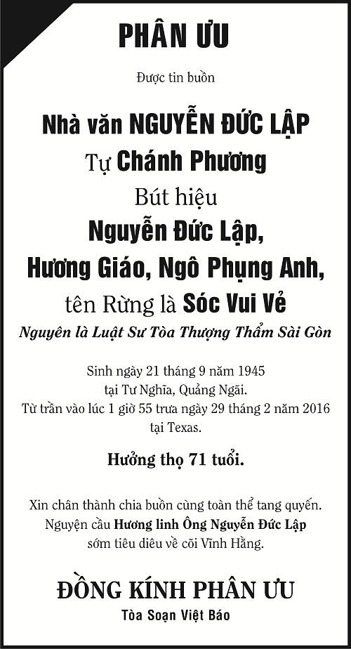 HOUSTON (VB) -- Mất mát lớn cho văn học Việt Nam: Nhà văn Nguyễn Đức Lập đã từ trần tại một bệnh viện ở Texas.