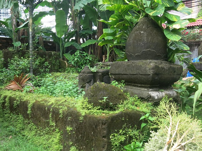 Phía bên trái khu từ đường là một khu vườn um tùm lùm chuối, cau kiểng, mít và tràn lan cỏ dại. Người viết đạp cỏ tìm đường vào. Mộ ông bà Bình Thành bá Trương Minh Giảng được xây bằng hợp chất cổ (ô dước) hoang tàn rêu phong, đầy dây leo cỏ dại… Mộ có kiến trúc: Vòng ngoài là bờ thành hình chữ nhật (khoảng 10 x 6 m, cao khoảng 0,6 m), nối liền với cổng mộ là 2 trụ đá vuông, trên đầu trụ có chạm búp sen lớn. Bình phong trước gồm 3 ô hình chữ nhật (ô giữa nhô lên), hai bên bình phong có trụ dạng cuốn thư. Vì rất hoang phế nên không biết được nguyên trạng bình phong này có chạm khắc chữ hay hình thù gì không. Phần mộ không có bia, cuối cùng là bình phong hậu nối liền với bờ thành, trên bình phong hậu cũng chẳng thể hình dung được nguyên trạng.