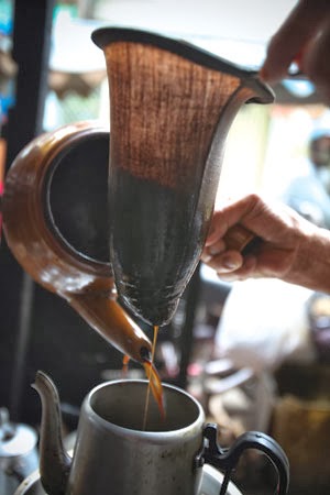 Ngày nào cũng vậy, chú Ba ra quán lúc 3-4 giờ sáng, nấu nước, bầy “hàng”. “Quán” chú Ba có mấy cái siêu đất rất ngộ. một lô “phin” pha cà phê làm bằng vải mỏng, người ta quen gọi là bí tất hay vớ (dzớ). So sánh như vậy cho thêm vui, chứ ai lại lấy dzớ pha cà phê cho khách bao giờ. Nhưng cà phê không pha bằng phin (filter) mà phải pha bằng vợt, rót vào cái siêu đất, rồi lại rót cà phê từ cái siêu đất vào một cái ly. Thế là đã có một ly xây chừng ngon…đáo để. Vợ chồng chú Ba bán đến 2-3 giờ chiều thì lo dọn dẹp.
