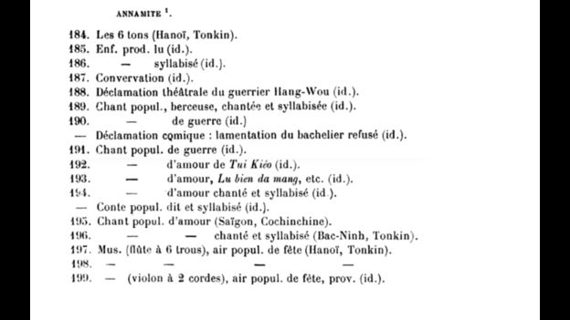 Các chuyên gia về nhạc truyền thống và biết nhiều hơn tôi nên nghe và phân loại các bản ghi âm sau. Có một bản ghi tên “Chant populaire d’amour de Tui Kiéo” (Tình ca dân gian của Thúy Kiều?) nghe như ngâm thơ kiểu hát chèo. Giọng phát âm của người ngâm không được rõ thì rất khó nắm bắt được từng lời. Mặc dù được đặt tên Tui Kiéo/Thúy Kiều tôi không nghe được câu thơ nào của thi ca Nguyễn Du.