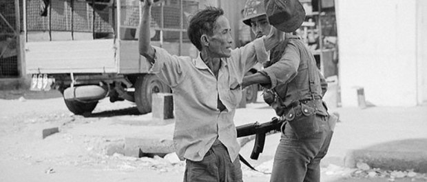 05 tháng 2/1968 : Một người lính VNCH đang lục soát tìm vũ khí giấu trong người của 1 ông già tình nghi là VC.