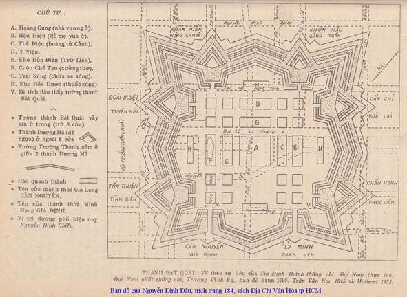 Thành Bát quái hay thành Qui là thành đất, đắp tháng 3-4/1790, đầu năm 1791 sửa lại (Thực lục, I, t. 268). Đến năm 1829, “[Lê Văn] Duyệt lại nghĩ Gia Định là trọng khẩn Nam Kỳ, bèn tâu xin thuê dân đánh đá ong, cấp thêm tiền gạo và lấy cả dân đinh, xây đắp thành hào cao rộng thêm lên để phòng thủ cho nghiêm. Vua [Minh Mạng] nghe cho làm”. (Liệt truyện, II, t. 426). Vậy có thể hiểu là Lê Văn Duyệt xây thêm lớp thành đá ong bên trong, và đào hào sâu hơn.