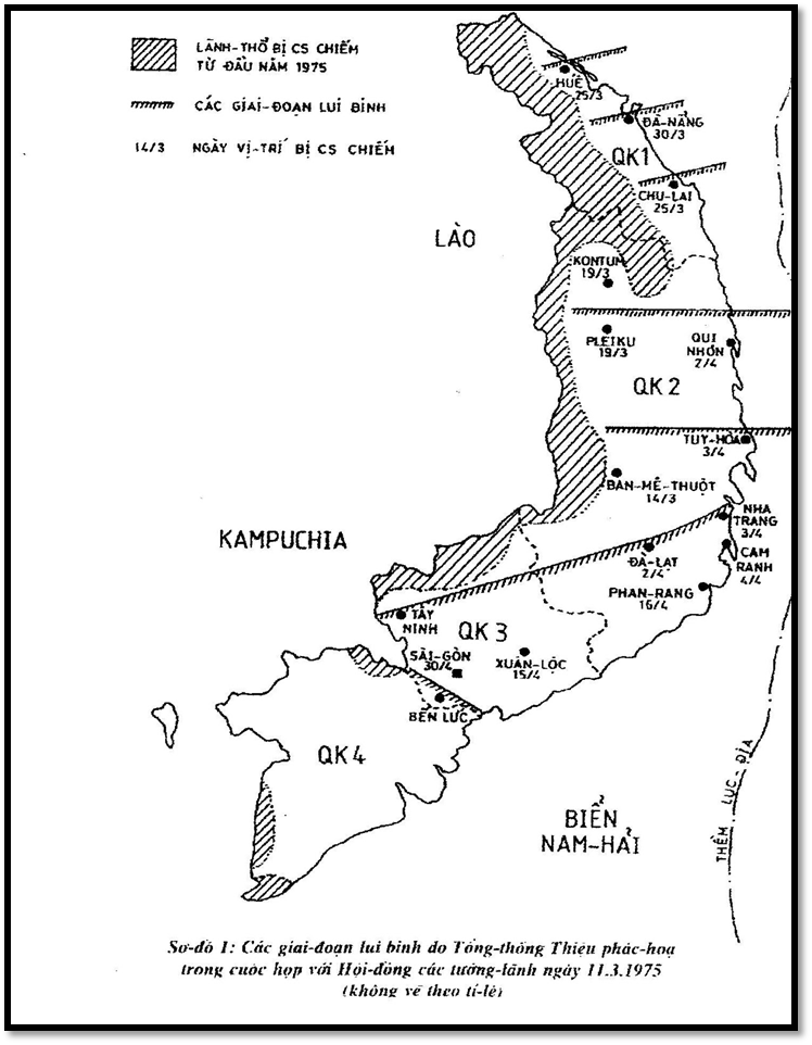 Một ngày sau khi cộng sản tấn công Ban Mê Thuột (11/03/1975), TT Thiệu họp với 3 tướng lãnh chủ chốt của chế độ là Trung Tướng Đặng Văn Quang, Cố vấn An ninh, Thủ Tướng Trần Thiện Khiêm, Đại Tướng Cao Văn Viên, Tổng Tham Mưu Trưởng. Sau khi duyệt xét tình hình, ông có quyết định: ”Với khả năng và lực lượng chúng ta đang có, chắc chắn chúng ta không bảo vệ được tất cả lãnh thổ. Như vậy, chúng ta nên tái phối trí lực lượng và bảo vệ những nơi đông dân, trù phú vì những vùng đất đó mới thực sự quan trọng” (Trần Đông Phong.VNCH, 10 ngày cuối cùng, tr.116).