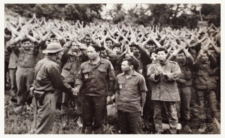Ðầu hàng của Trung Ðoàn 56thuộc Sư Ðoàn 3 BB tại Trại Carroll -- Trung Tá Phạm VănÐính (đầu trần) bắt tay sĩ quanBắc Việt(đội mũ vải)